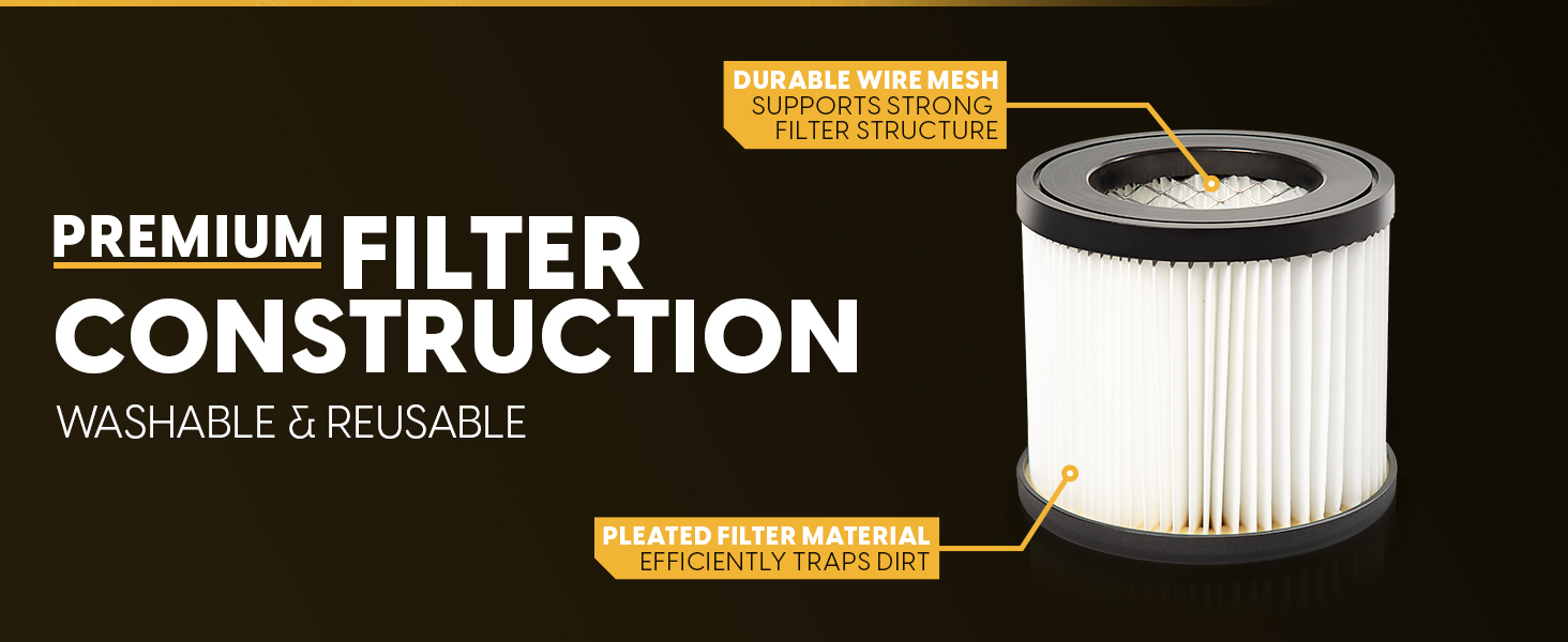 Designed for dry pick-up, the washable cartridge filter and retainer is ideal for tackling debris, dirt, sawdust, and more.