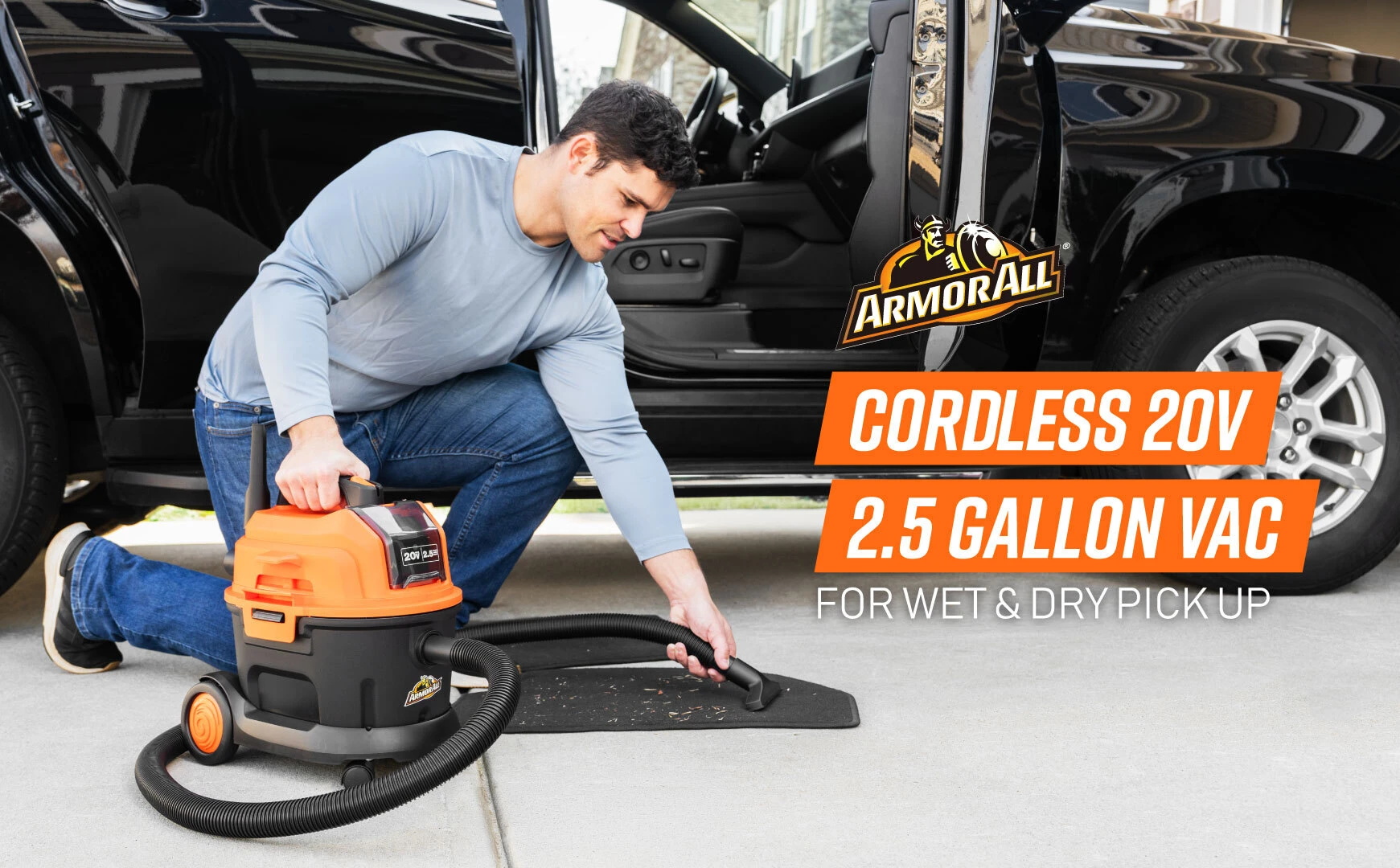 Tackle messes anywhere with the power and convenience of the Armor All Cordless 20V Wet/Dry Vac. Enjoy hassle-free cleaning without being tethered to an outlet, perfect for on-the-go use and hard-to-reach areas. The 20V DC motor delivers strong suction with up to 42 CFM airflow and 52 air watts of power for efficient debris pickup. A durable 2.5-gallon tank reduces the need for frequent emptying, so you can clean more in less time. This unit easily converts to a blower – great for clearing leaves and debris from the windshield, tires or driveway. Designed for portability and performance, this compact yet powerful vacuum makes cleanup effortless -whether you're in the garage, car, workshop, or home.