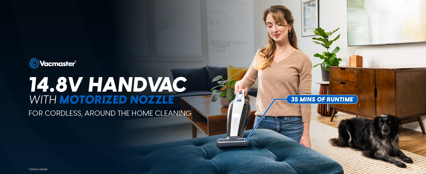 Tackle everyday messes anywhere in your home with the Vacmaster 14.8V Cordless Hand Vac Designed for powerful, convenient cleaning, this compact vacuum delivers strong suction performance with a motorized nozzle that easily lifts ground-in dirt, pet hair, crumbs, and debris from carpets, upholstery, and more. Enjoy the freedom of cordless cleaning with up to 35 minutes of runtime* on a single charge. The two-speed settings let you customize suction power for light touch-ups or deep cleaning tasks.