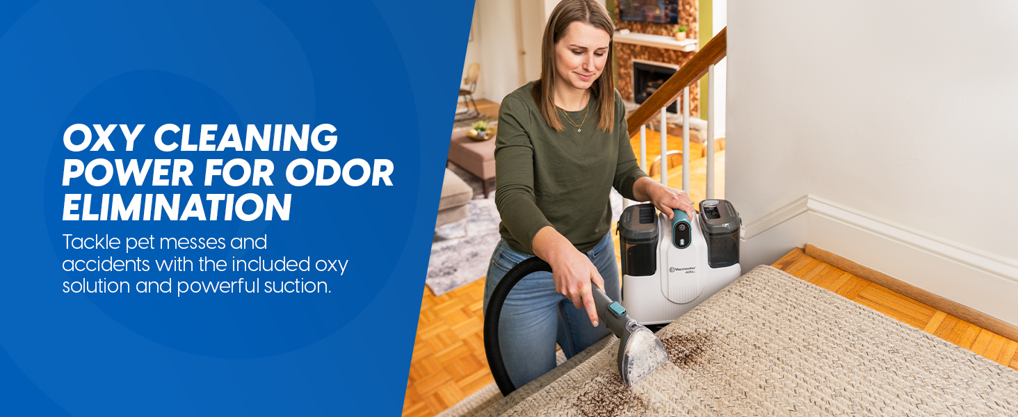 Powered by the MX24V battery system, this cordless spot cleaner lets you clean freely from one area to the next—whether you’re tackling a spill in the living room, refreshing furniture, or cleaning stains on the stairs. The included oxy cleaning solution helps fight odors at the source, making it especially useful for homes with pets.