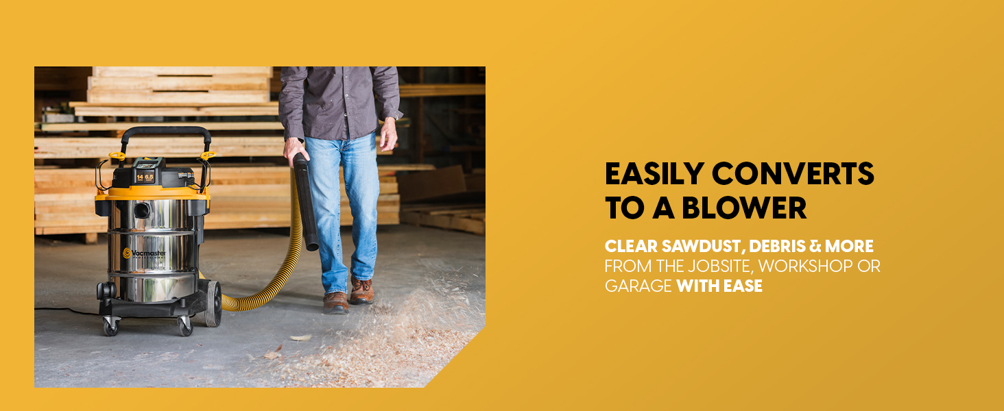 Designed for mobility, this vac is equipped with smooth-rolling ball-bearing casters, oversized rear wheels, and a padded push handle for effortless transport. Need to clear leaves or debris? Quickly convert the vacuum into a powerful blower with a simple setup. When it’s time to empty the tank, large locking latches provide easy access, and the oversized drain port allows for fast, mess-free liquid disposal.