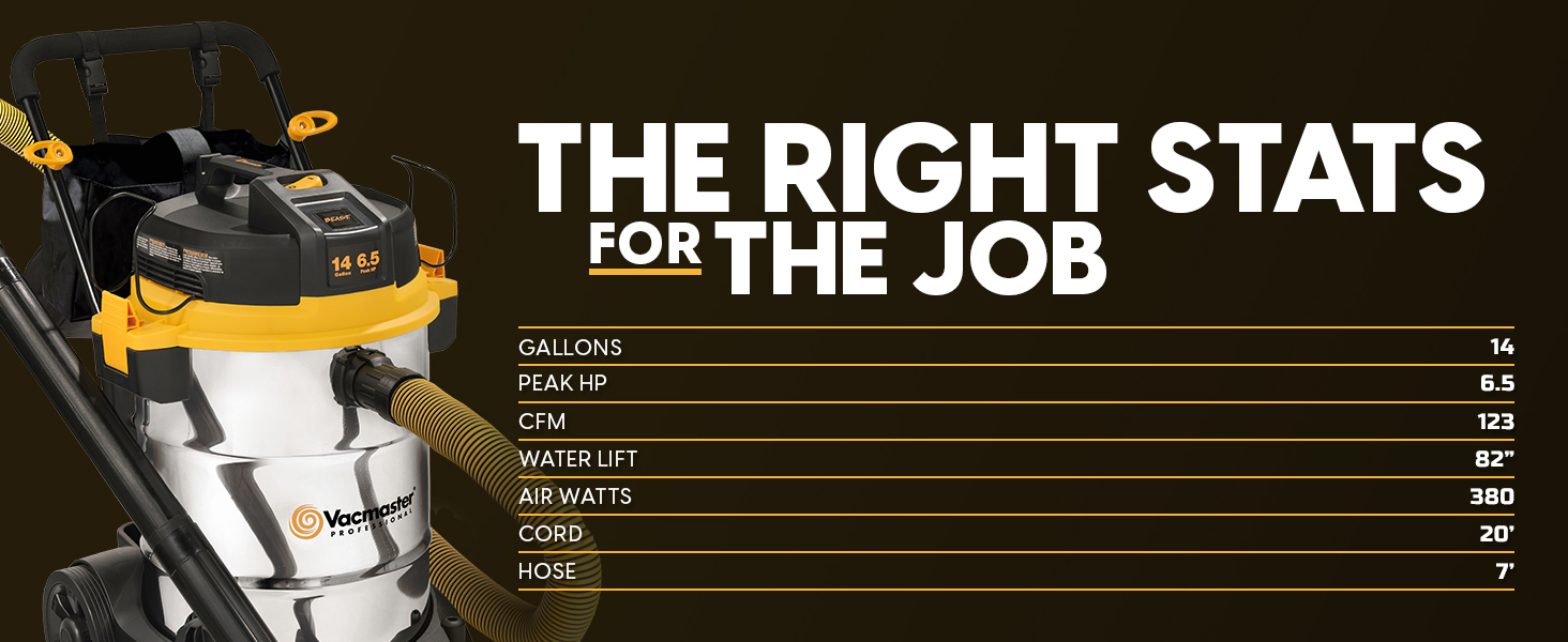 Take on any cleanup challenge with the Vacmaster Professional® Beast Series™ 14-Gallon* Wet/Dry Vacuum. Built for demanding jobs, this powerful vacuum features a robust 6.5 Peak HP† motor designed to handle even the toughest messes with ease. The large stainless-steel tank provides high-capacity performance for big projects, while the innovative flat power head design and integrated accessory bag keep essential tools within easy reach.