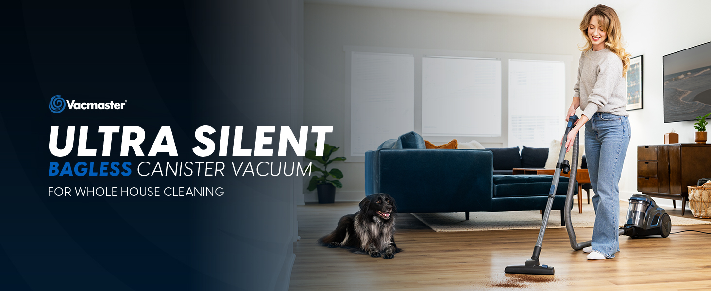 Experience powerful, whole-home cleaning without the noise. The Vacmaster Ultra Silent Bagless Canister Vacuum delivers strong suction and ultra-quiet operation, running at just 68 dB, so you can clean without disrupting your household. Engineered for versatility, this lightweight canister vacuum features powerful suction with adjustable airflow that lets you customize your clean on carpets, hard floors, rugs, and more. Easily control the airflow for powerful deep cleaning or gentle dust removal on delicate surfaces. The Vacmaster CC0501 includes a complete accessory set to tackle every mess - a crevice tool for tight spaces, corners, and baseboards; a built-in dust tool to clean scratch-prone surfaces like screens or blinds; and a dusting brush for multi-surface cleaning and everyday use. Enjoy effortless cleaning with the 16-foot retractable power cord and onboard accessory storage that keeps your tools organized and within reach. Perfect for picking up pet hair, crumbs, dust, and dirt all around your home.